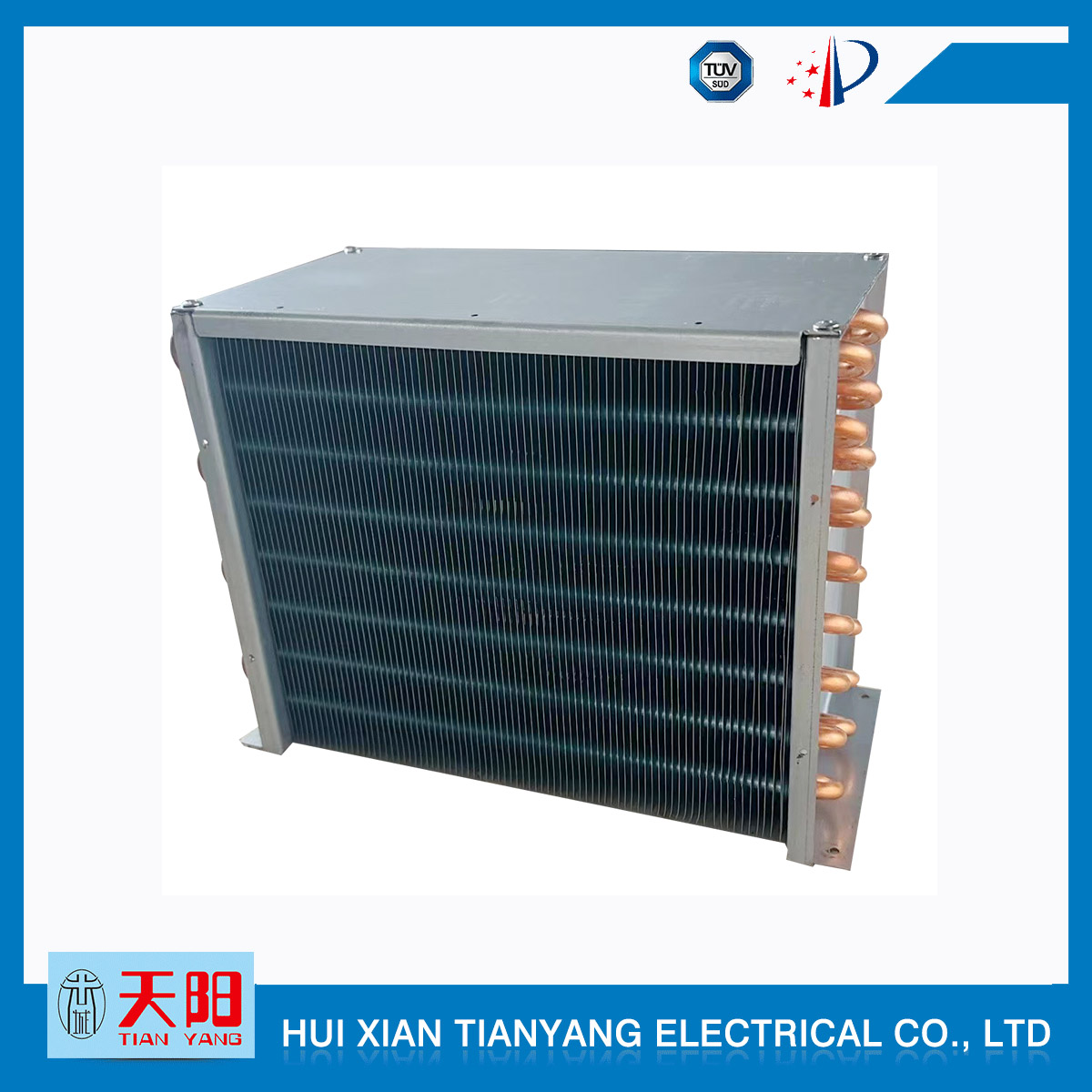 輝縣天陽電器有限責任公司位于肥沃的中原河南省輝縣市學院路中段工業集聚區興業園3號廠房,以制冷設備用冷凝器,蒸發器,熱交換器為主。主要材料為銅管鋁翅片,銅管銅翅片,鋁管鋁翅片。廣泛應用于冰箱冰柜,制冷設備,暖通設備,空調,自動售貨機,冷干機,超市立風柜,冷藏車,烘干機等產品領域。  公司自1998年成立以來,始終堅持:“科技造就產業、質量成就信譽、誠信鑄就輝煌”的質量方針,從產品拓展上堅持“人無我有,人有我優,人優我特的”經營理念,25年來,從1998年開始供應河南冰熊集團下屬的冷柜廠,制冰機廠各種冷凝器;2003年之后,原冰熊集團的精英志士開始在全國各地發展,所到之處依托我公司供貨,以致于多家目前已具行業中佼佼者的公司,從而建立了如凱雪公司,兆邦公司、凌云公司、海寶公司、正雪公司、上海忠云、山東德萊維等幾十余家公司在草創時期的啟蒙供貨商,友好共贏長達十余年,成為我國制冷行業的供應商。以致在2015年初雙匯集團面向社會的招標書中指名要我公司冷凝器、蒸發器指定產品供應商